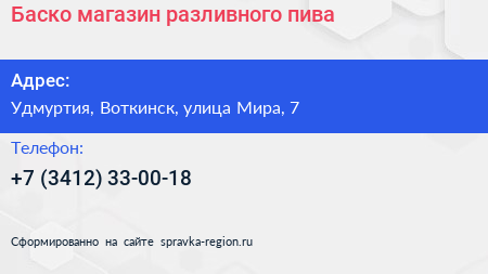 Баско, магазин разливного пива по адресу Удмуртия, Воткинск, улица Мира, 7 в дальнейшем Организация, размещена в следующих категориях: