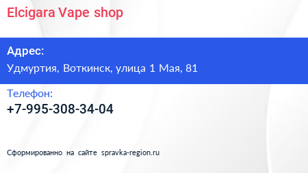 Elcigara Vape shop по адресу Удмуртия, Воткинск, улица 1 Мая, 81 в дальнейшем Организация, размещена в следующих категориях: