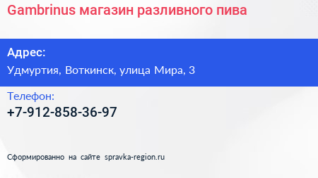 Gambrinus, магазин разливного пива по адресу Удмуртия, Воткинск, улица Мира, 3 в дальнейшем Организация, размещена в следующих категориях: