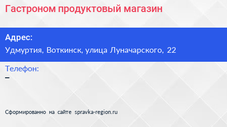 Гастроном, продуктовый магазин по адресу Удмуртия, Воткинск, улица Луначарского, 22 в дальнейшем Организация, размещена в следующих категориях: