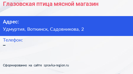 Глазовская птица, мясной магазин по адресу Удмуртия, Воткинск, Садовникова, 2 в дальнейшем Организация, размещена в следующих категориях: