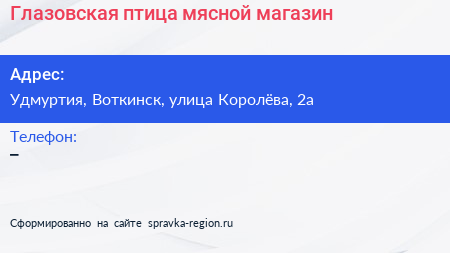 Глазовская птица, мясной магазин по адресу Удмуртия, Воткинск, улица Королёва, 2а в дальнейшем Организация, размещена в следующих категориях: