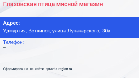 Глазовская птица, мясной магазин по адресу Удмуртия, Воткинск, улица Луначарского, 30а в дальнейшем Организация, размещена в следующих категориях: