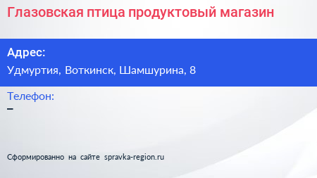 Глазовская птица, продуктовый магазин по адресу Удмуртия, Воткинск, Шамшурина, 8 в дальнейшем Организация, размещена в следующих категориях: