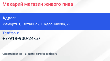 Макарий, магазин живого пива по адресу Удмуртия, Воткинск, Садовникова, 6 в дальнейшем Организация, размещена в следующих категориях: