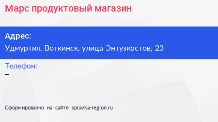 Марс, продуктовый магазин по адресу Удмуртия, Воткинск, улица Энтузиастов, 23 в дальнейшем Организация, размещена в следующих категориях: