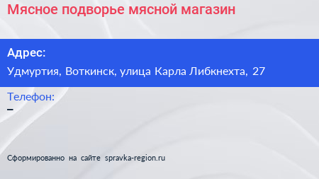Мясное подворье, мясной магазин по адресу Удмуртия, Воткинск, улица Карла Либкнехта, 27 в дальнейшем Организация, размещена в следующих категориях: