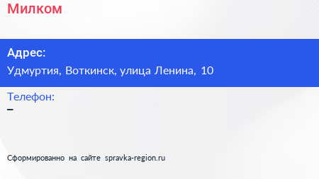 Милком по адресу Удмуртия, Воткинск, улица Ленина, 10 в дальнейшем Организация, размещена в следующих категориях: