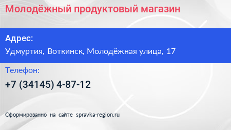 Молодёжный, продуктовый магазин по адресу Удмуртия, Воткинск, Молодёжная улица, 17 в дальнейшем Организация, размещена в следующих категориях: