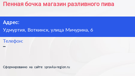 Пенная бочка, магазин разливного пива по адресу Удмуртия, Воткинск, улица Мичурина, 6 в дальнейшем Организация, размещена в следующих категориях: