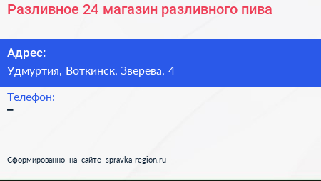 Разливное 24, магазин разливного пива по адресу Удмуртия, Воткинск, Зверева, 4 в дальнейшем Организация, размещена в следующих категориях: