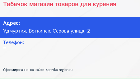 Табачок, магазин товаров для курения по адресу Удмуртия, Воткинск, Серова улица, 2 в дальнейшем Организация, размещена в следующих категориях: