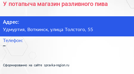 У потапыча, магазин разливного пива по адресу Удмуртия, Воткинск, улица Толстого, 55 в дальнейшем Организация, размещена в следующих категориях: