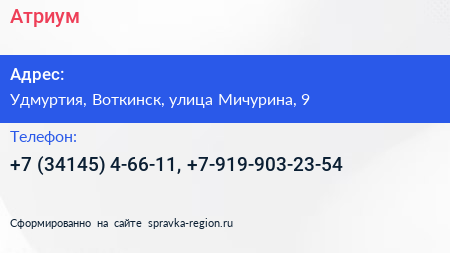 Атриум по адресу Удмуртия, Воткинск, улица Мичурина, 9 в дальнейшем Организация, размещена в следующих категориях: