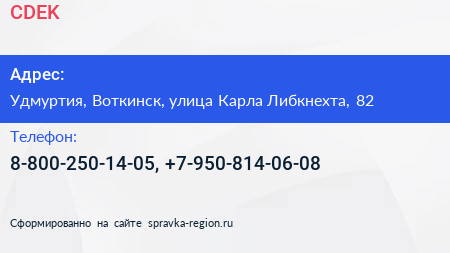CDEK по адресу Удмуртия, Воткинск, улица Карла Либкнехта, 82 в дальнейшем Организация, размещена в следующих категориях: