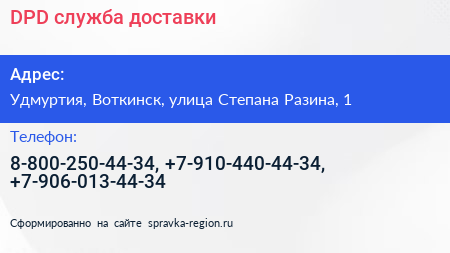 DPD, служба доставки по адресу Удмуртия, Воткинск, улица Степана Разина, 1 в дальнейшем Организация, размещена в следующих категориях:
