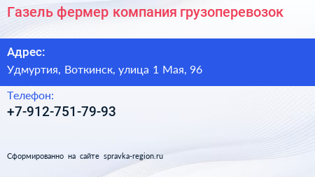 Газель-фермер, компания грузоперевозок по адресу Удмуртия, Воткинск, улица 1 Мая, 96 в дальнейшем Организация, размещена в следующих категориях: