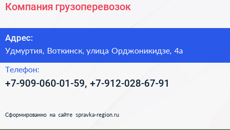 Компания грузоперевозок по адресу Удмуртия, Воткинск, улица Орджоникидзе, 4а в дальнейшем Организация, размещена в следующих категориях: