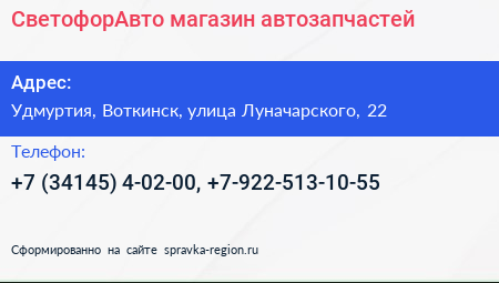 СветофорАвто, магазин автозапчастей по адресу Удмуртия, Воткинск, улица Луначарского, 22 в дальнейшем Организация, размещена в следующих категориях:
