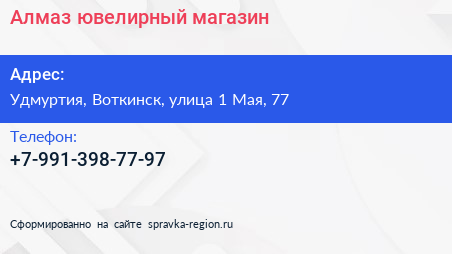 Алмаз, ювелирный магазин по адресу Удмуртия, Воткинск, улица 1 Мая, 77 в дальнейшем Организация, размещена в следующих категориях: