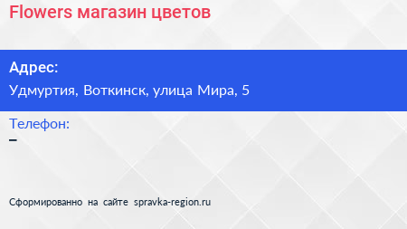 Flowers, магазин цветов по адресу Удмуртия, Воткинск, улица Мира, 5 в дальнейшем Организация, размещена в следующих категориях: