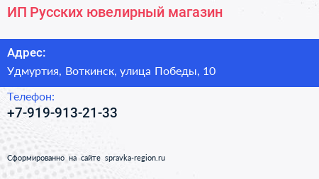 ИП Русских, ювелирный магазин по адресу Удмуртия, Воткинск, улица Победы, 10 в дальнейшем Организация, размещена в следующих категориях: