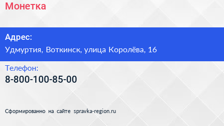 Монетка по адресу Удмуртия, Воткинск, улица Королёва, 16 в дальнейшем Организация, размещена в следующих категориях:
