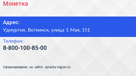 Монетка по адресу Удмуртия, Воткинск, улица 1 Мая, 151 в дальнейшем Организация, размещена в следующих категориях: