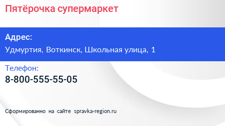 Пятёрочка, супермаркет по адресу Удмуртия, Воткинск, Школьная улица, 1 в дальнейшем Организация, размещена в следующих категориях: