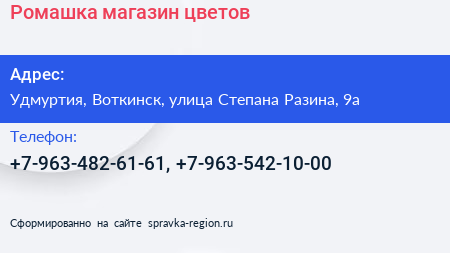 Ромашка, магазин цветов по адресу Удмуртия, Воткинск, улица Степана Разина, 9а в дальнейшем Организация, размещена в следующих категориях: