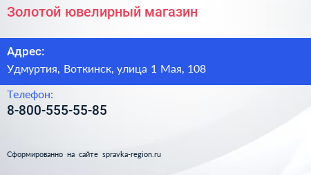 Золотой, ювелирный магазин по адресу Удмуртия, Воткинск, улица 1 Мая, 108 в дальнейшем Организация, размещена в следующих категориях: