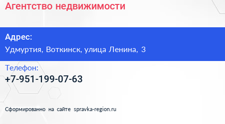 Агентство недвижимости по адресу Удмуртия, Воткинск, улица Ленина, 3 в дальнейшем Организация, размещена в следующих категориях: