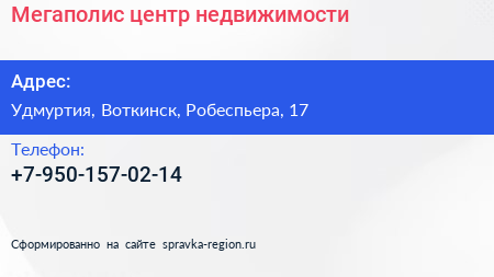 Мегаполис, центр недвижимости по адресу Удмуртия, Воткинск, Робеспьера, 17 в дальнейшем Организация, размещена в следующих категориях: