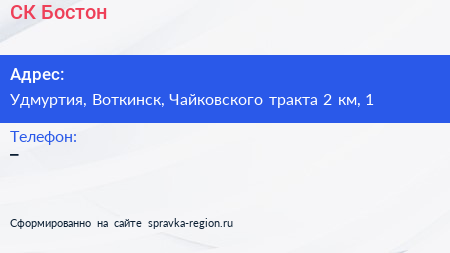 СК Бостон по адресу Удмуртия, Воткинск, Чайковского тракта 2 км, 1 в дальнейшем Организация, размещена в следующих категориях: