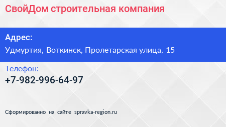 СвойДом, строительная компания по адресу Удмуртия, Воткинск, Пролетарская улица, 15 в дальнейшем Организация, размещена в следующих категориях: