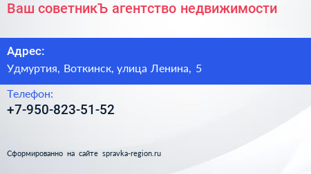 Ваш советникЪ, агентство недвижимости по адресу Удмуртия, Воткинск, улица Ленина, 5 в дальнейшем Организация, размещена в следующих категориях: