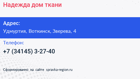 Надежда, дом ткани по адресу Удмуртия, Воткинск, Зверева, 4 в дальнейшем Организация, размещена в следующих категориях: