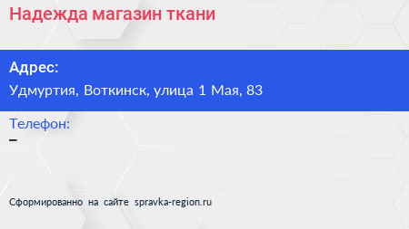 Надежда, магазин ткани по адресу Удмуртия, Воткинск, улица 1 Мая, 83 в дальнейшем Организация, размещена в следующих категориях: