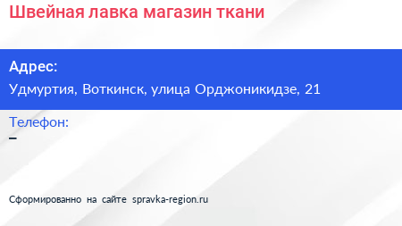 Швейная лавка, магазин ткани по адресу Удмуртия, Воткинск, улица Орджоникидзе, 21 в дальнейшем Организация, размещена в следующих категориях: