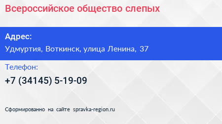 Всероссийское общество слепых по адресу Удмуртия, Воткинск, улица Ленина, 37 в дальнейшем Организация, размещена в следующих категориях: