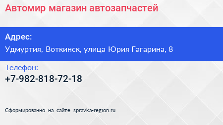 Автомир, магазин автозапчастей по адресу Удмуртия, Воткинск, улица Юрия Гагарина, 8 в дальнейшем Организация, размещена в следующих категориях: