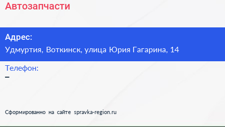 Автозапчасти по адресу Удмуртия, Воткинск, улица Юрия Гагарина, 14 в дальнейшем Организация, размещена в следующих категориях: