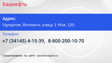 Башнефть по адресу Удмуртия, Воткинск, улица 1 Мая, 120 в дальнейшем Организация, размещена в следующих категориях: