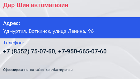 Дар-Шин, автомагазин по адресу Удмуртия, Воткинск, улица Ленина, 96 в дальнейшем Организация, размещена в следующих категориях: