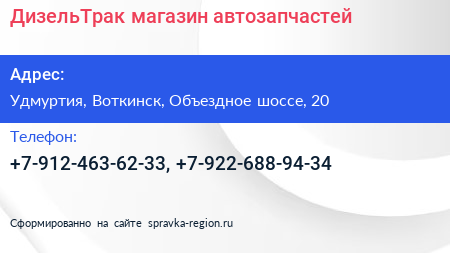 ДизельТрак, магазин автозапчастей по адресу Удмуртия, Воткинск, Объездное шоссе, 20 в дальнейшем Организация, размещена в следующих категориях: