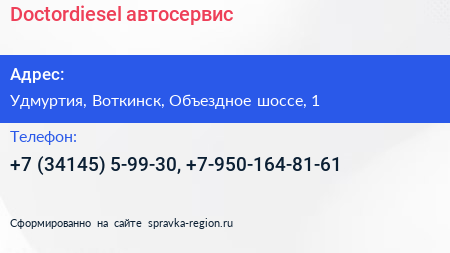 Doctordiesel, автосервис по адресу Удмуртия, Воткинск, Объездное шоссе, 1 в дальнейшем Организация, размещена в следующих категориях: