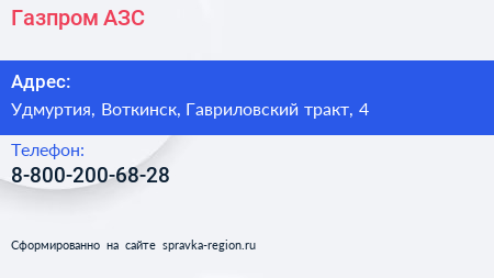 Газпром, АЗС по адресу Удмуртия, Воткинск, Гавриловский тракт, 4 в дальнейшем Организация, размещена в следующих категориях: