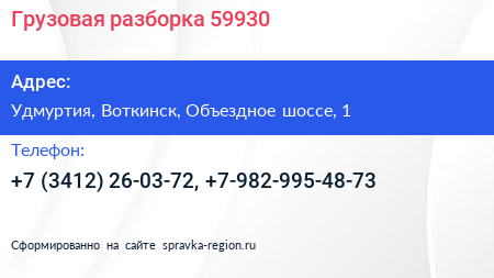 Грузовая разборка 59930 по адресу Удмуртия, Воткинск, Объездное шоссе, 1 в дальнейшем Организация, размещена в следующих категориях: