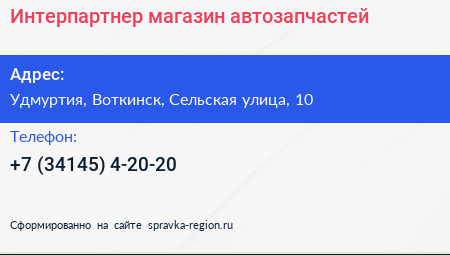 Интерпартнер, магазин автозапчастей по адресу Удмуртия, Воткинск, Сельская улица, 10 в дальнейшем Организация, размещена в следующих категориях: