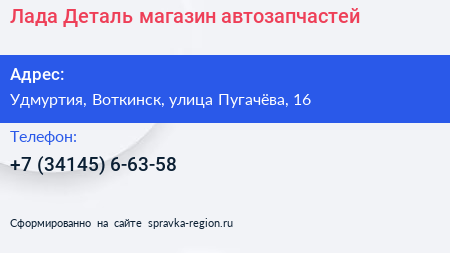 Лада Деталь, магазин автозапчастей по адресу Удмуртия, Воткинск, улица Пугачёва, 16 в дальнейшем Организация, размещена в следующих категориях: